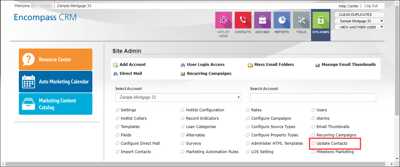 - On the Site Admin page, click the Update Contacts link.