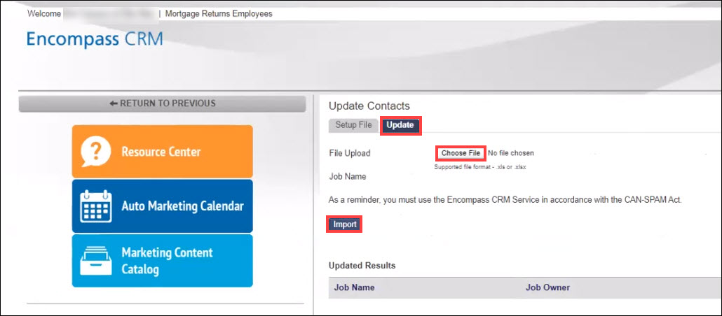Note that the Updated Results table updates with your job name, your name, date and time of import, and the status of the import. This is identical to the Import Contacts (Import Wizard) feature.