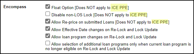 We are excited to announce the rebranding of the Encompass Product & Pricing Service to ICE PPE. As part of this initiative, the Encompass section of the Options page (Admin>Settings>Options) has been updated in this release to use the new name.