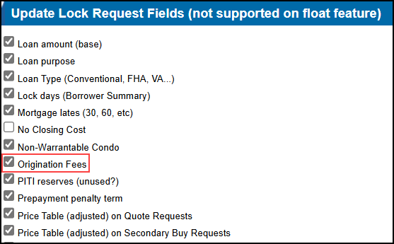 A new Origination Fees option has been added to the Update Lock Request Fields page under the Settings tab. If this checkbox is selected, origination fees will be automatically populated during a Lock event (i.e., initial lock, relock, or lock update).