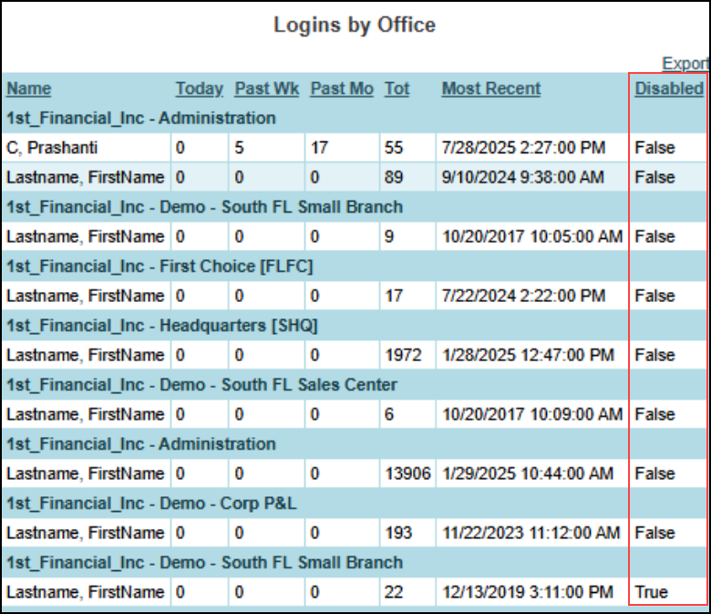 Disabled users are now included in the “Logins by Office” report. A new column, “Disabled”, has been added to the report, with the possible values of “True” or “False”.