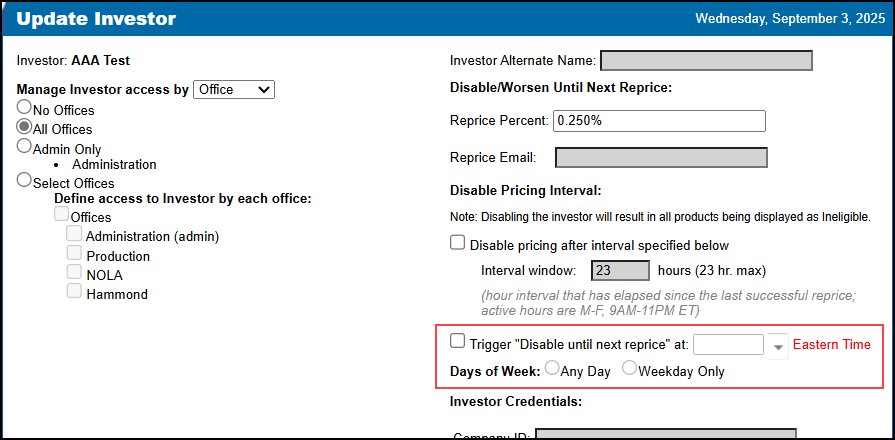 New Trigger “Disable until next reprice” at [Select Time] and Days of the Week options have been added to the Update Investor page under the Dashboard tab. These new options enable you to disable pricing for an individual Investor.