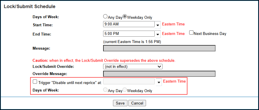 Click on the Trigger “Disable until next reprice at [Select Time] checkbox and then select or enter a time in the dropdown field.