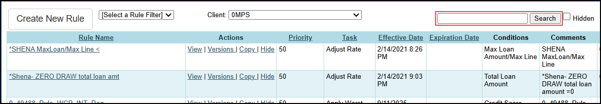 Using Search will filter the Rules on the listing page and return only the Rules with the search text in the Rule Name.