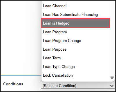 Two new Conditions, "Loan is Hedged" and "Prepay Penalty Term", have been added to the Rule Definition.