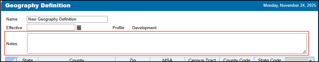 A new Notes field has been added to the Geography Definition.