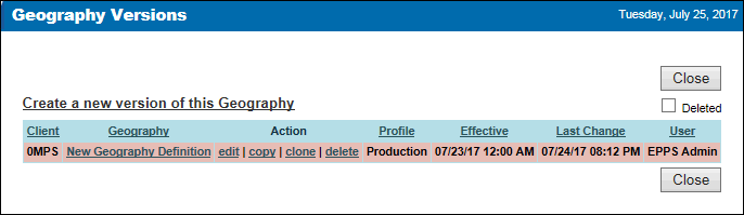 From this page, you can edit, copy, clone, or delete versions of a Geography.