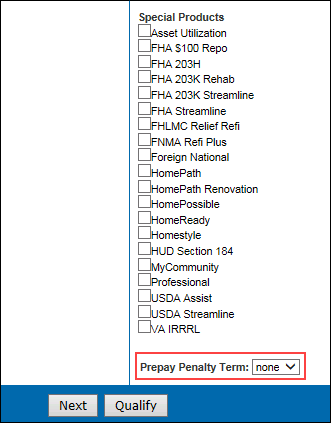 For a loan program to be included in the Qualification results, the prepay penalty term selected here must be the same as the one selected on the Custom Program Definition.