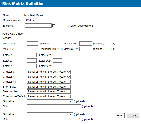 The ability to create Risk Matrix Definitions has been added to the Risk Grades Listing page to ensure Non-QM are qualified properly,