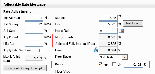 For example, if the margin plus the index equals 8.589%, and SYS.X1 = up and 1700 = 0.125%, the Adjusted Fully Indexed Rate value (3296) is now calculated to 8.625%.