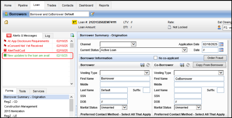 When backend changes like the examples above are made to a loan via an API, a new message - New updates to the loan are available - is added to the Alerts & Messages tab in the Loan Log to notify the user in the Encompass desktop interface.