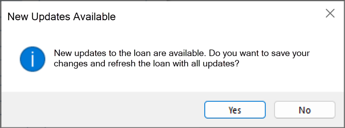 If the user clicks Yes, all changes are saved and the loan is refreshed to display the most current values. The pop-up message is closed and the message notification in the Loan Log is then removed. If the user clicks No, the pop-up window is closed and no changes to the loan are saved. The message notification in the Loan Log remains. If changes were made to the same area of the loan and there is a conflict, the manual change performed by the user always takes precedence.