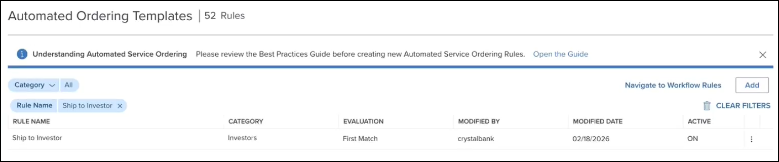 On the Investor Rule page, enter the following information. (Please note, instead of a new template, the screenshot below shows an existing automated ordering template.)