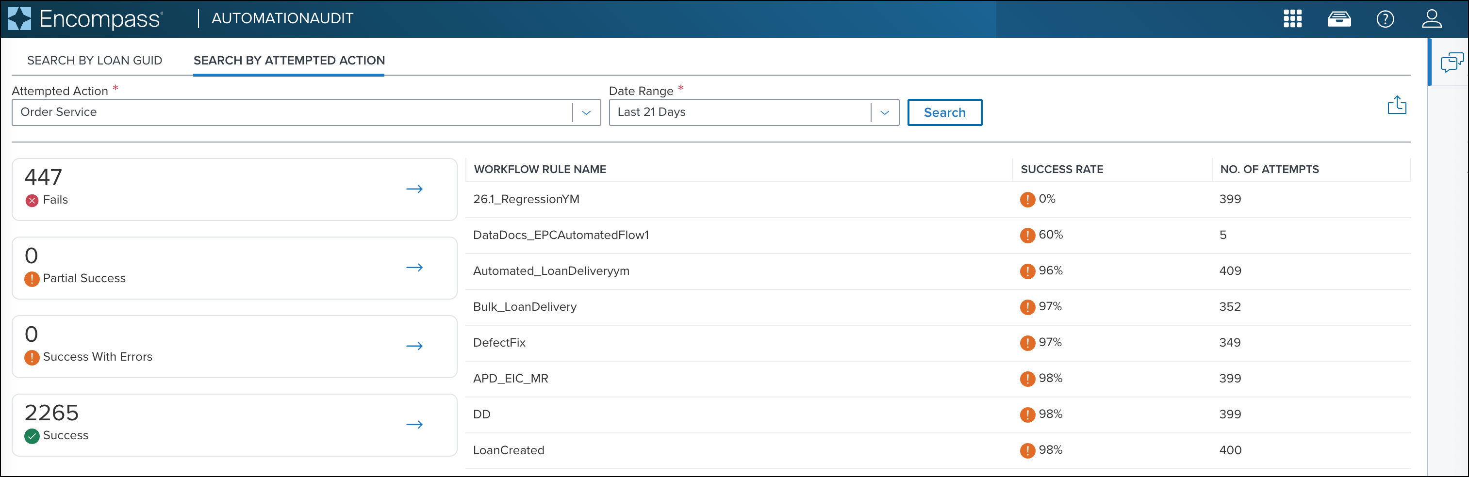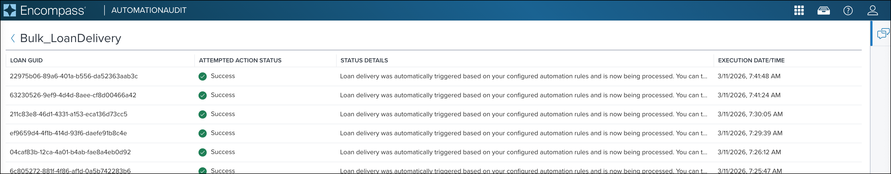 The Automation Audit page enables you to view the details of packages delivered using automation. The page offers you two views, by loan GUID or by attempted action.