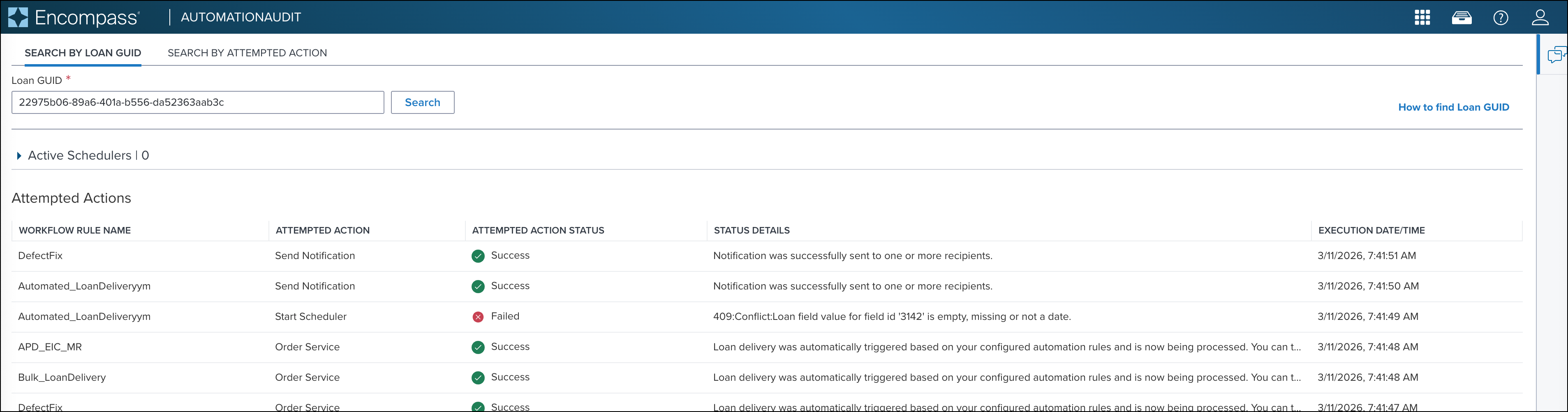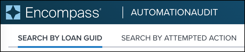 On the Automation Audit page, select either the Search by Loan GUID or Search by Attempted Action tab.
