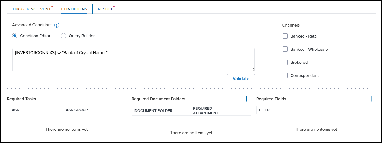 You can avoid this scenario by defining a condition on the Conditions tab. In the screenshot below, we are using field INVESTORCONN.X3 to stop the trigger if the closed loan has already been delivered to the investor.