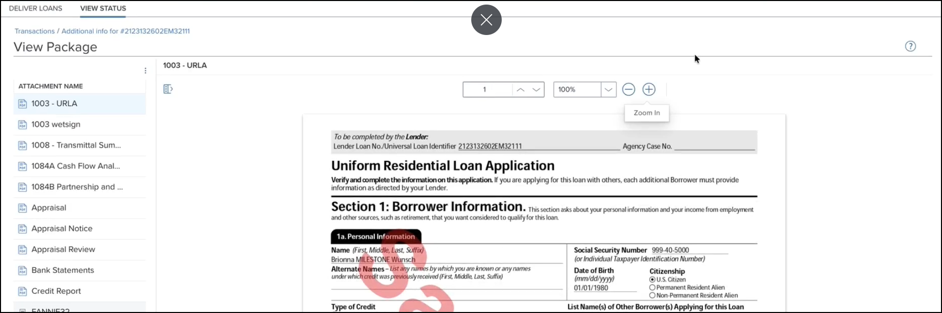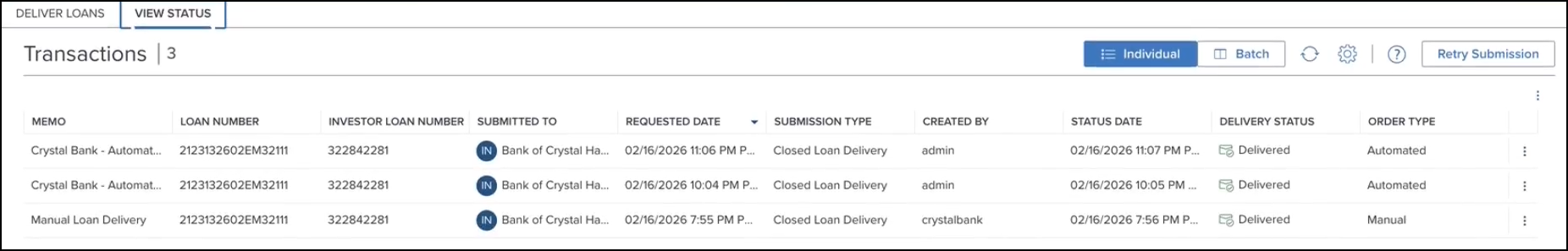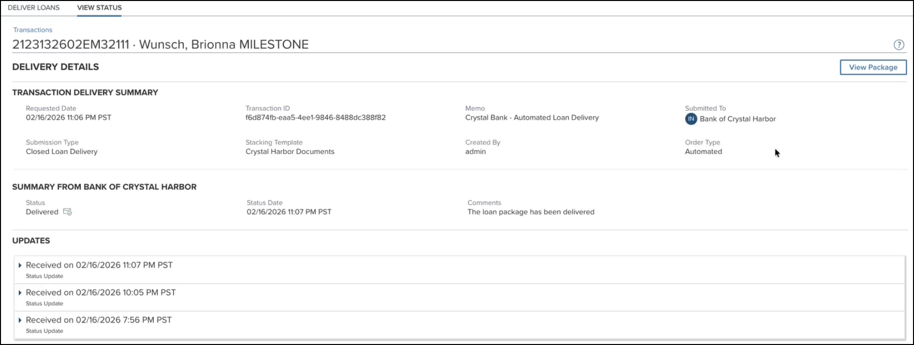 On the View Status page, you can check that the Delivery Status is "Delivered", the Submitted To is the correct investor, and the Order Type is "Automated".