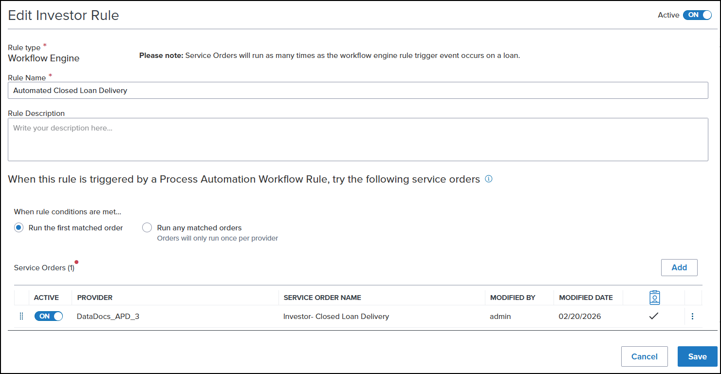 You can set up service orders for all Investor Connect closed loan deliveries in the same way. One service order for each investor.
