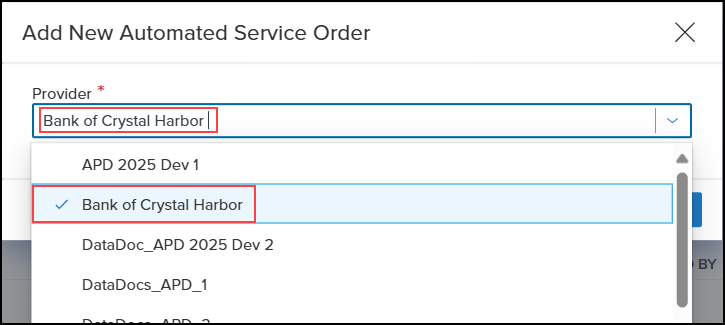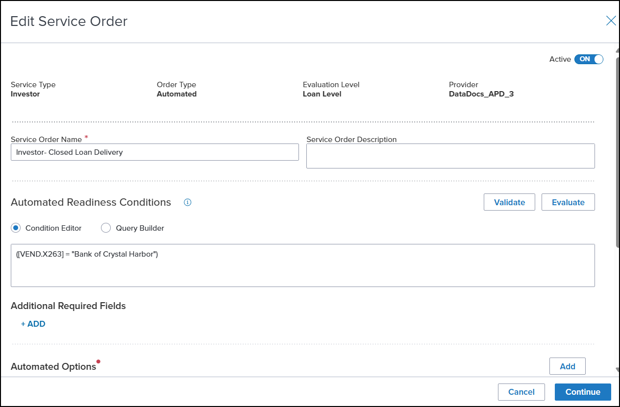 Define your conditions in the Automated Readiness Conditions section. These help the system determine which service order needs to be executed. In the screenshot above, a filter has been added using the investor name. The service order will only be executed when the investor name in field VEND.X263 is set to "Bank of Crystal Harbor".