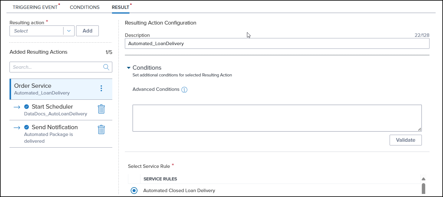 Define results on the Result tab. You must select an Order Service, enter a description under Resulting Action Configuration, and select a service rule.