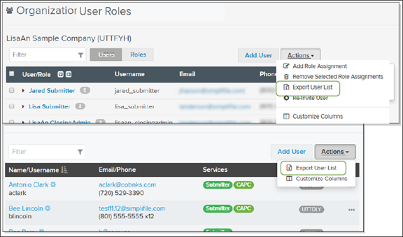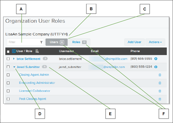 - The Organization User & Roles page Users tab displays all Simplifile users at that organization and their roles. Below is an example of the Users tab. The username displays first, with one person’s roles displayed beneath.