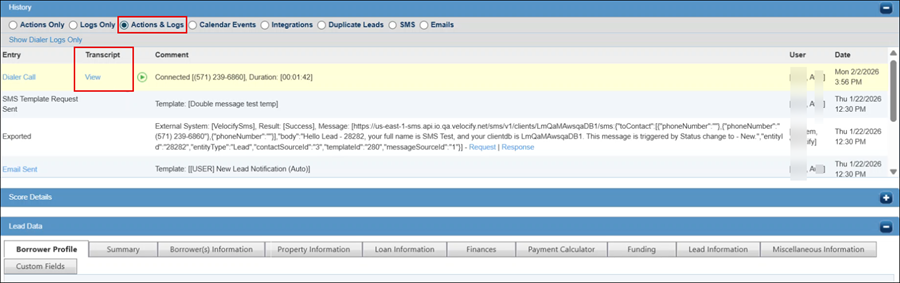 Hyperlink: Transcript now hyperlinked in Lead Add/Edit, Lead Call Summary, and Inbound Call Details pages. Click the View link to open a new browser window and view the transcript.