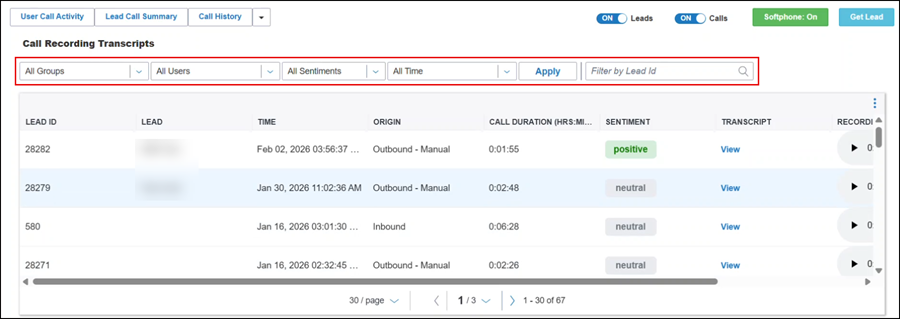 New Report: A new Call Recording Transcripts report is available with this release. You can filter by Groups, Users, Sentiments, Time, and search by Lead ID.