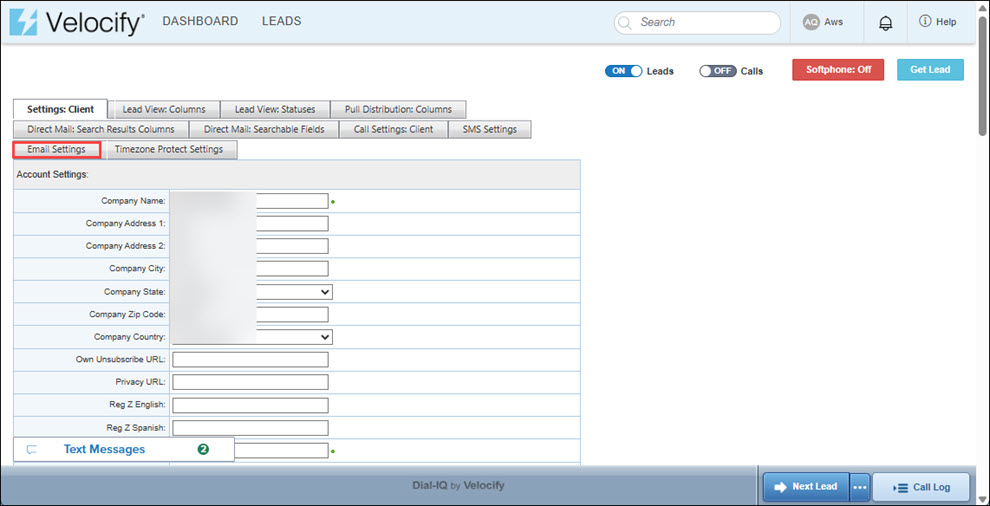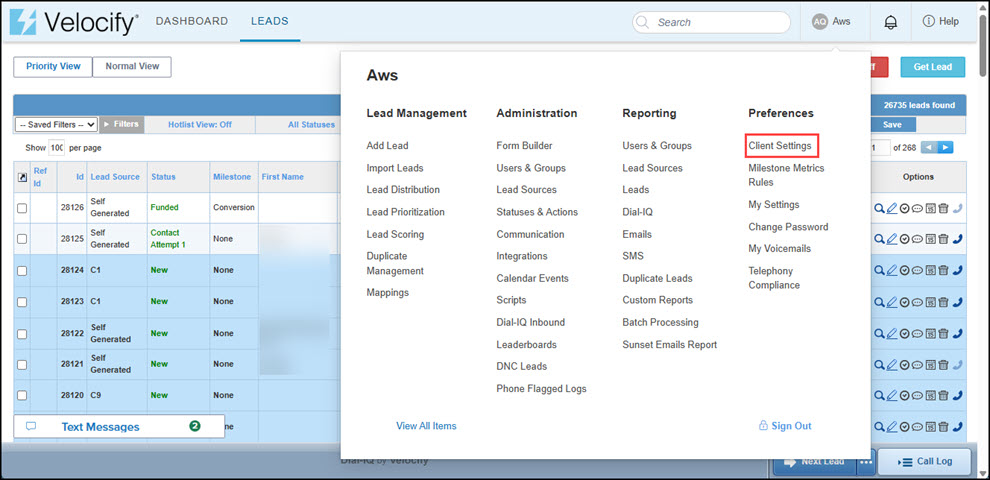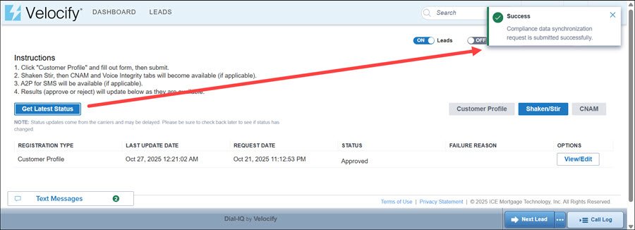 Go to Preferences> Telephony Compliance>, and click the Get Latest Status button. Note that a Success message displays confirming the data synch between Velocify and Twilio