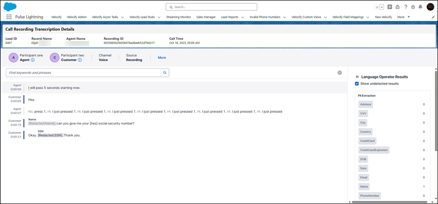 Redact is permanently enabled (cannot be disabled). Names, phone numbers, Social Security numbers, addresses, and all other PII are removed from the transcript.