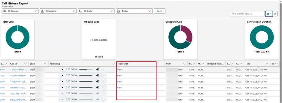 This displays the Transcript column. Click the View link to open a new tab and view the transcript. Note that for calls without recordings. the Transcript column is blank.