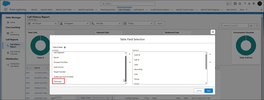 In the Table Field Selection window, go to Transcript and move it from the Available to Selected panel. Click Save.