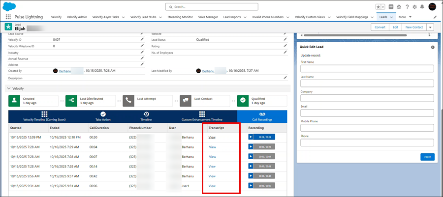 If Call Transcription is enabled, you can view a transcript of any Call Recording.