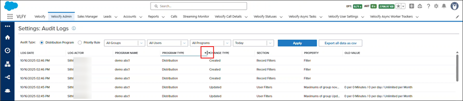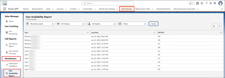 A log is added each time the Leads or Calls button is changed for a user.