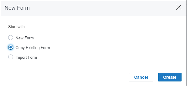 In the form builder workspace, after clicking the New button to start a new form, then select Copy Existing Form, and then click the Create button.