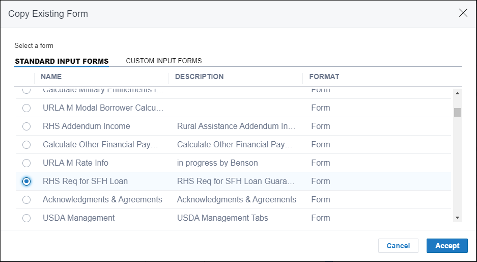 In the next window, select a form from the Standard Input Forms tab, and then click the Accept button.